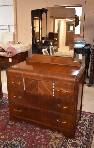 Hoping it goes to a good home. Art Deco Waterfall Highboy Dresser Mahogany inlays Amber mix bake lite pulls. A gorgeous Art Deco ornate carved walnut dresser with mirror USA 1930s Carved walnut book-matched burled walnut drawer fronts beveled mirror Measures.